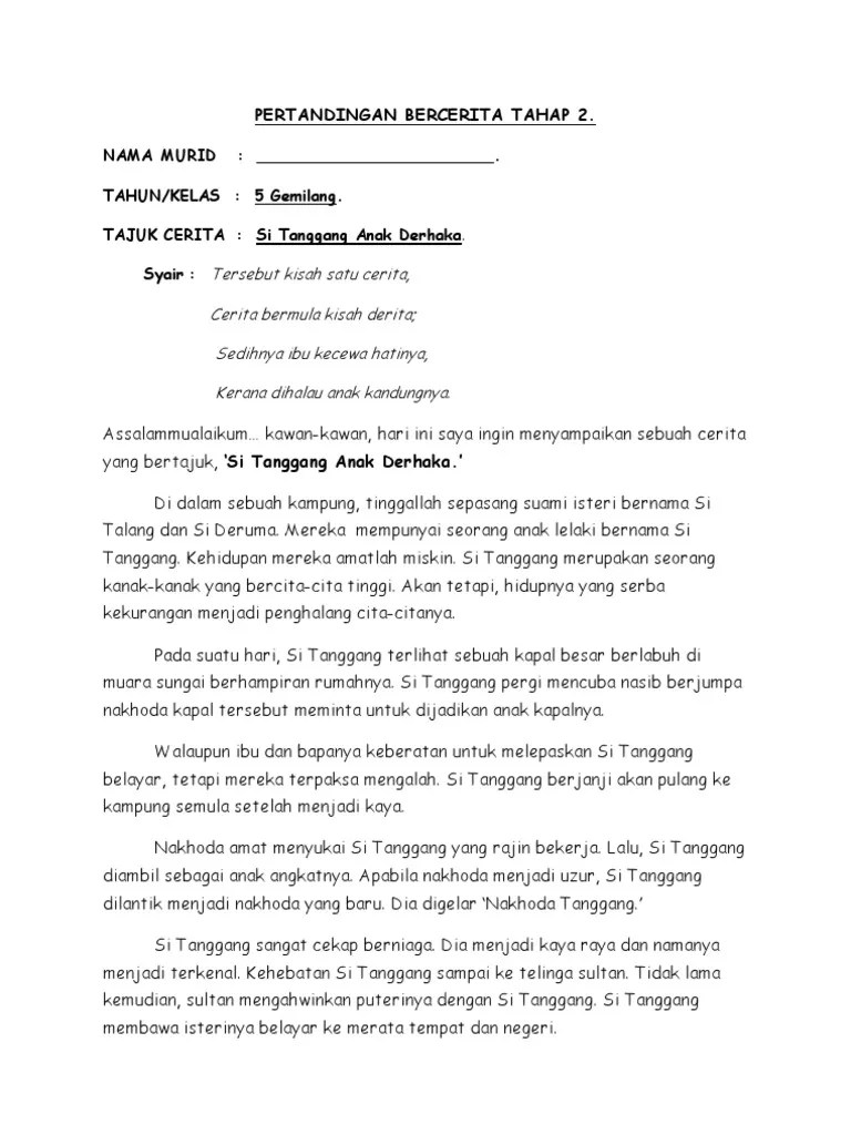 Skrip pertandingan bercerita bahasa melayu tahap 1. Si tanggang anak derhaka syair . Teks bercerita tahap 1 sekolah rendah 2017. Skrip pertandingan bercerita bahasa melayu tahap 1. Teks pertandingan bercerita tahap 2 by nurul_ayuni_39. Sk (p) bandar tinggi tajuk cerita : Contoh teks pertandingan bercerita bahasa melayu sekolah rendah tahap 2. 5.2 cerita yang dipilih perlulah bersesuaian dengan tahap umur murid. Dokumentasi pertandingan bercerita bahasa melayu tahap 1 dan 2 nur azlina bt. Teks cerita bahasa melayu untuk pertandingan berita jakarta. Teks juruacara pertandingan bercerita kategori sekolah rendah.